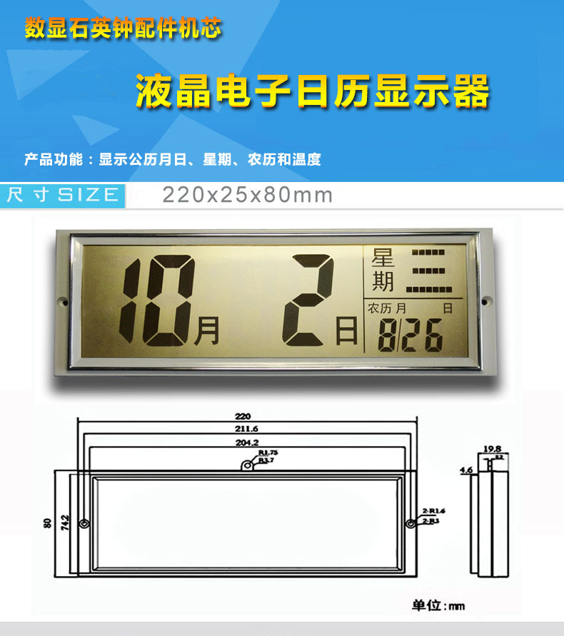 挂钟万年历电子日历显示屏石英钟表机芯大号液晶日历配件220x80mm,批发价,价格:35,厂家直销,挂钟万年历电子日历显示屏石英钟表机芯大号液晶日历配件220x80mm,免费拿样。
