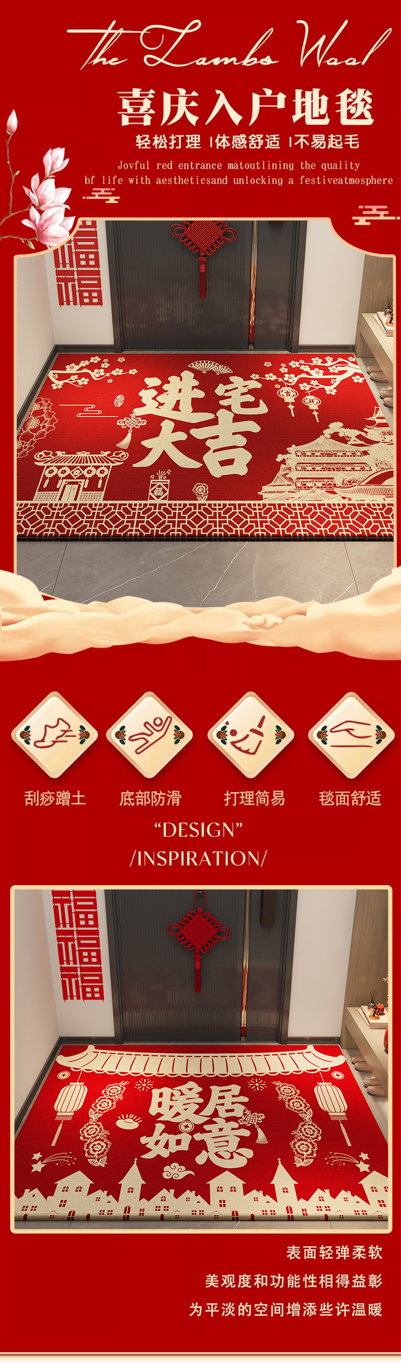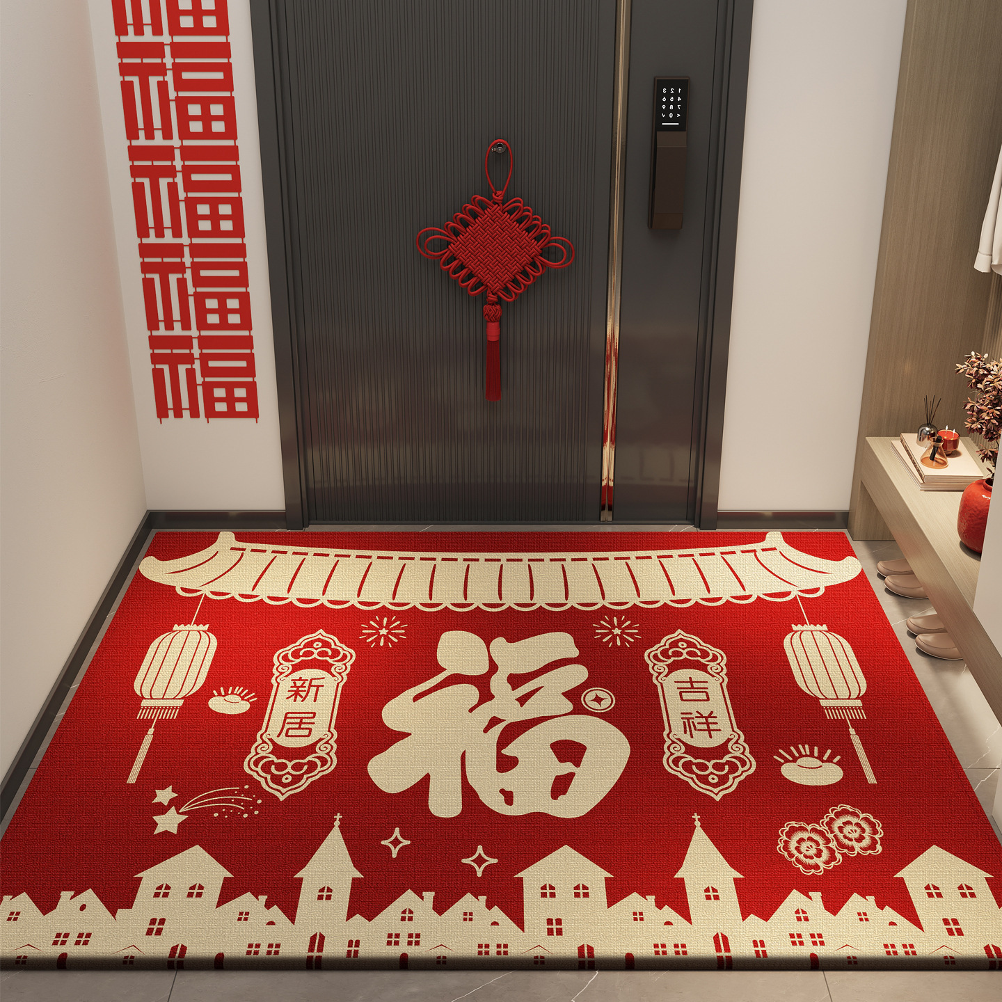 进宅大吉入户门地垫进门玄关耐脏蹭土防滑脚垫喜庆红色可裁剪地毯