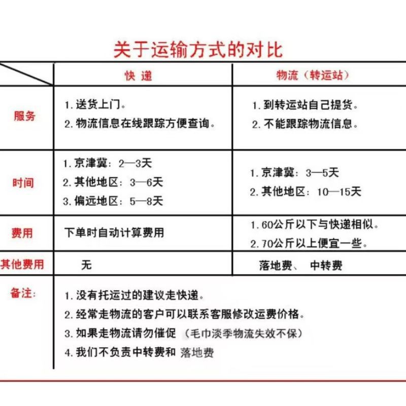 本店小批量货物全部由快递发货(本店推荐快递公司—中通.韵达.国通.快递),当货物数量,体积,重量达到一定标准为了为您剩下运费成本建议物流发货(推荐物流公司——安能物流.德邦物流等等) ,如有需要还可以发货其他物流。本店发货原则是尽可能地为买家省下运费降低成本。