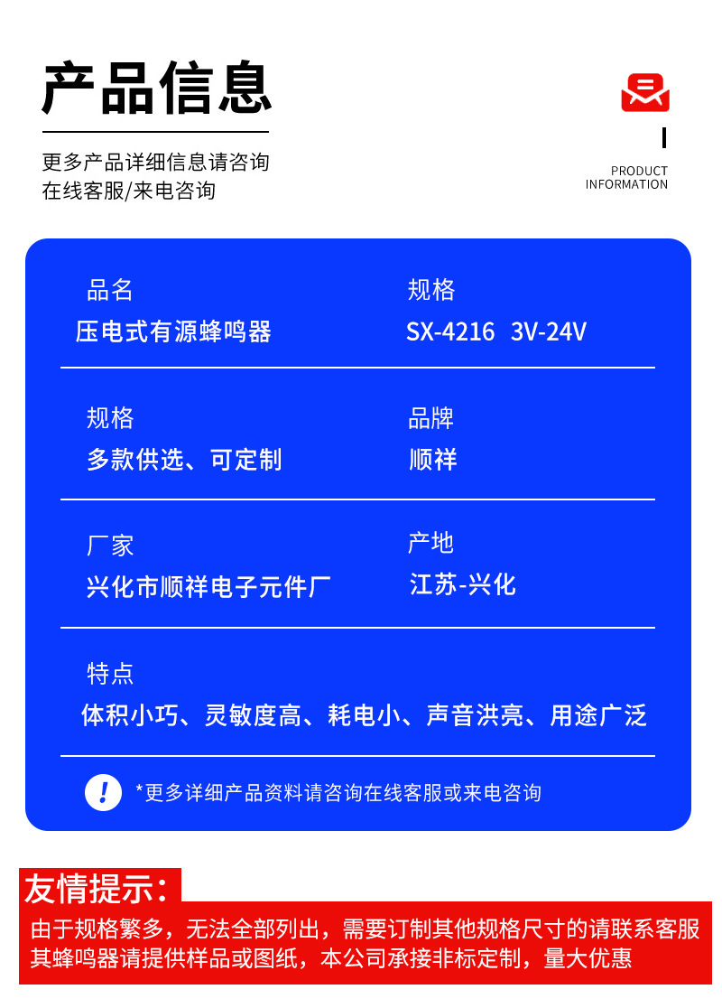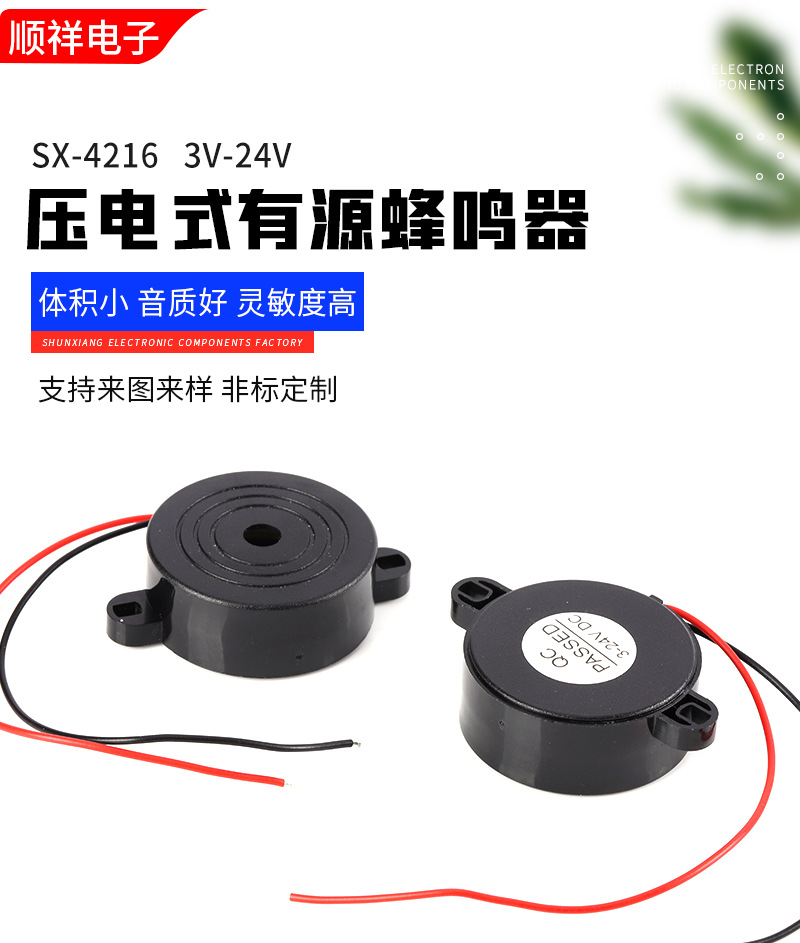4216有源压电式焊线蜂鸣器报警器42*16MM高分贝带耳朵连续声3-24V,批发价,价格:1.85,厂家直销,4216有源压电式焊线蜂鸣器报警器42*16MM高分贝带耳朵连续声3-24V,免费拿样。