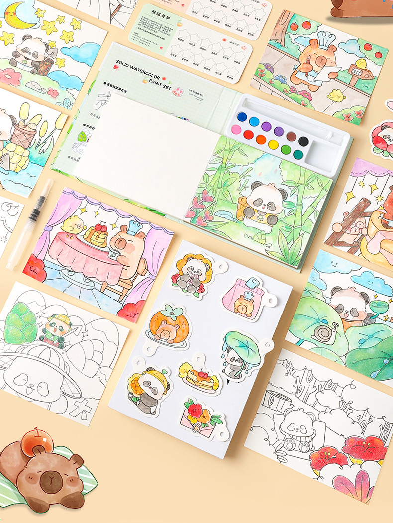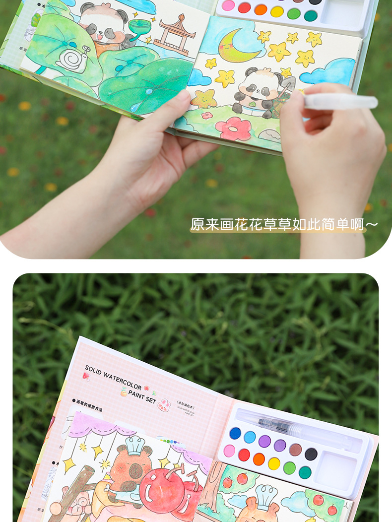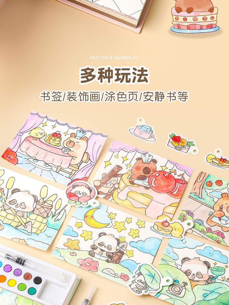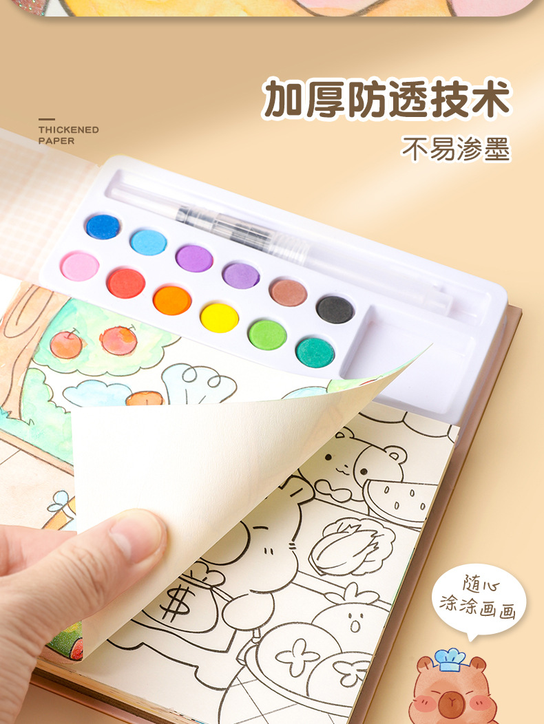 水彩填色本儿童文具通益智安静书自带颜料沾水即画解压涂色创意书