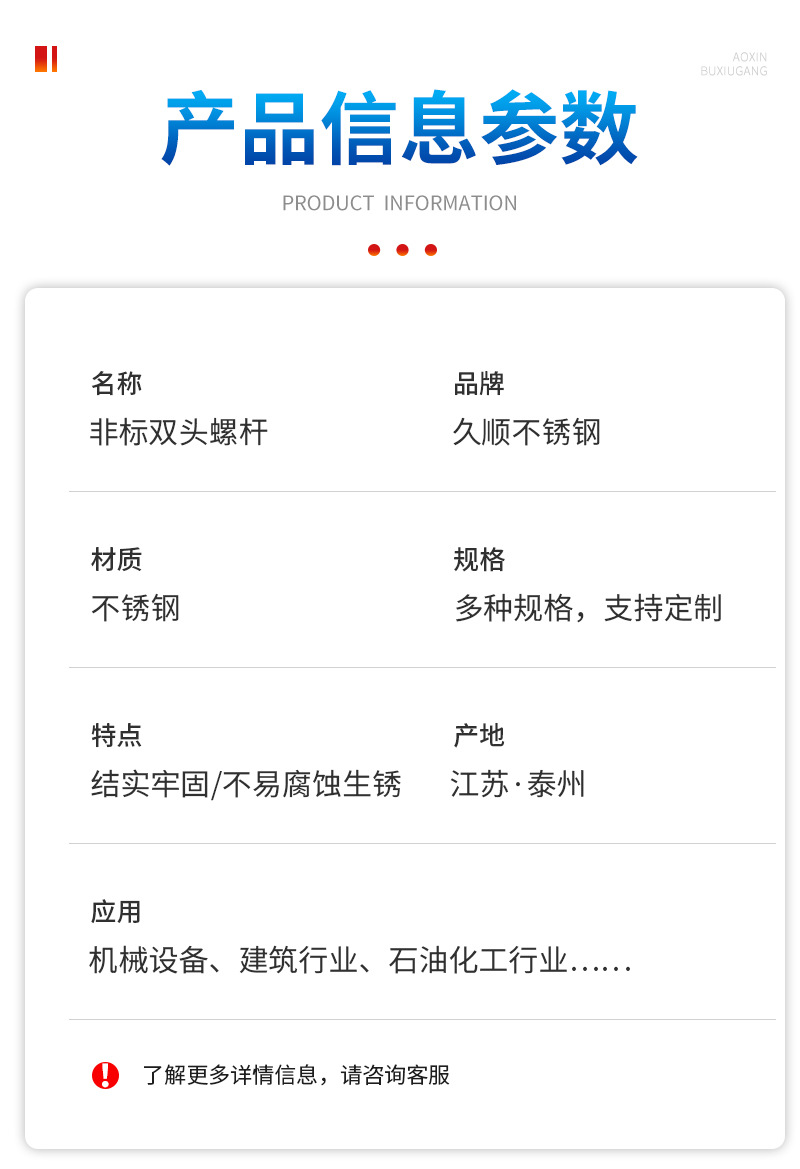 推荐理由:304不锈钢非标双头螺杆通丝牙条双头螺纹牙棒不等长双头螺杆