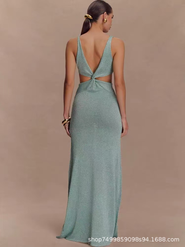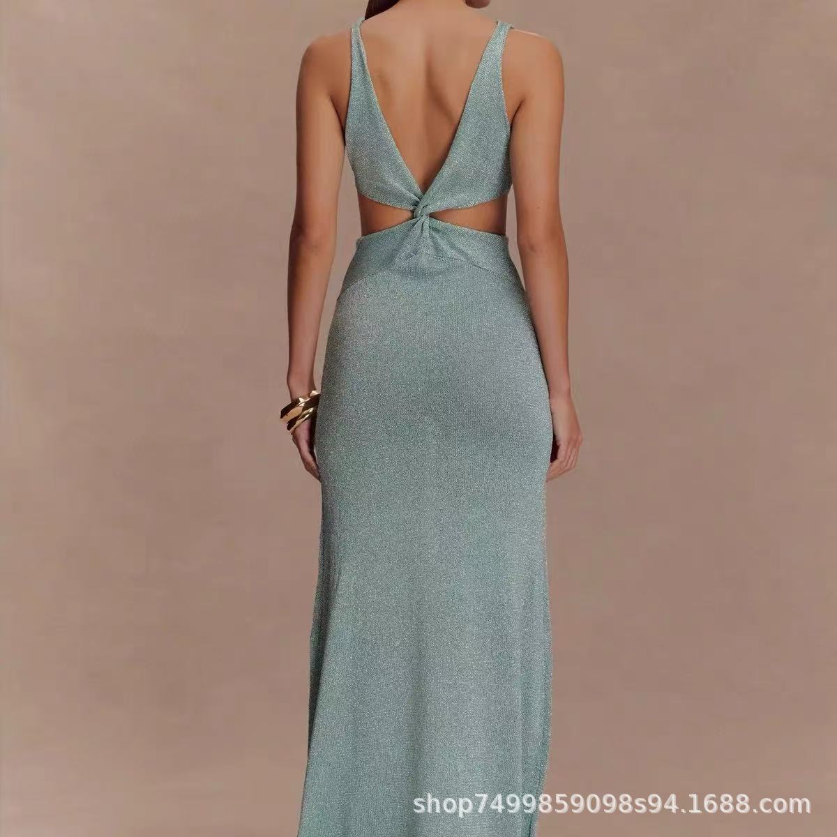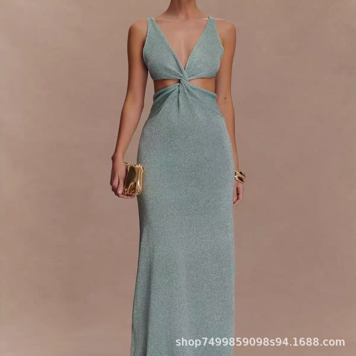 2025新款设计跨境欧美性感扭结背心长裙金银线春夏v领