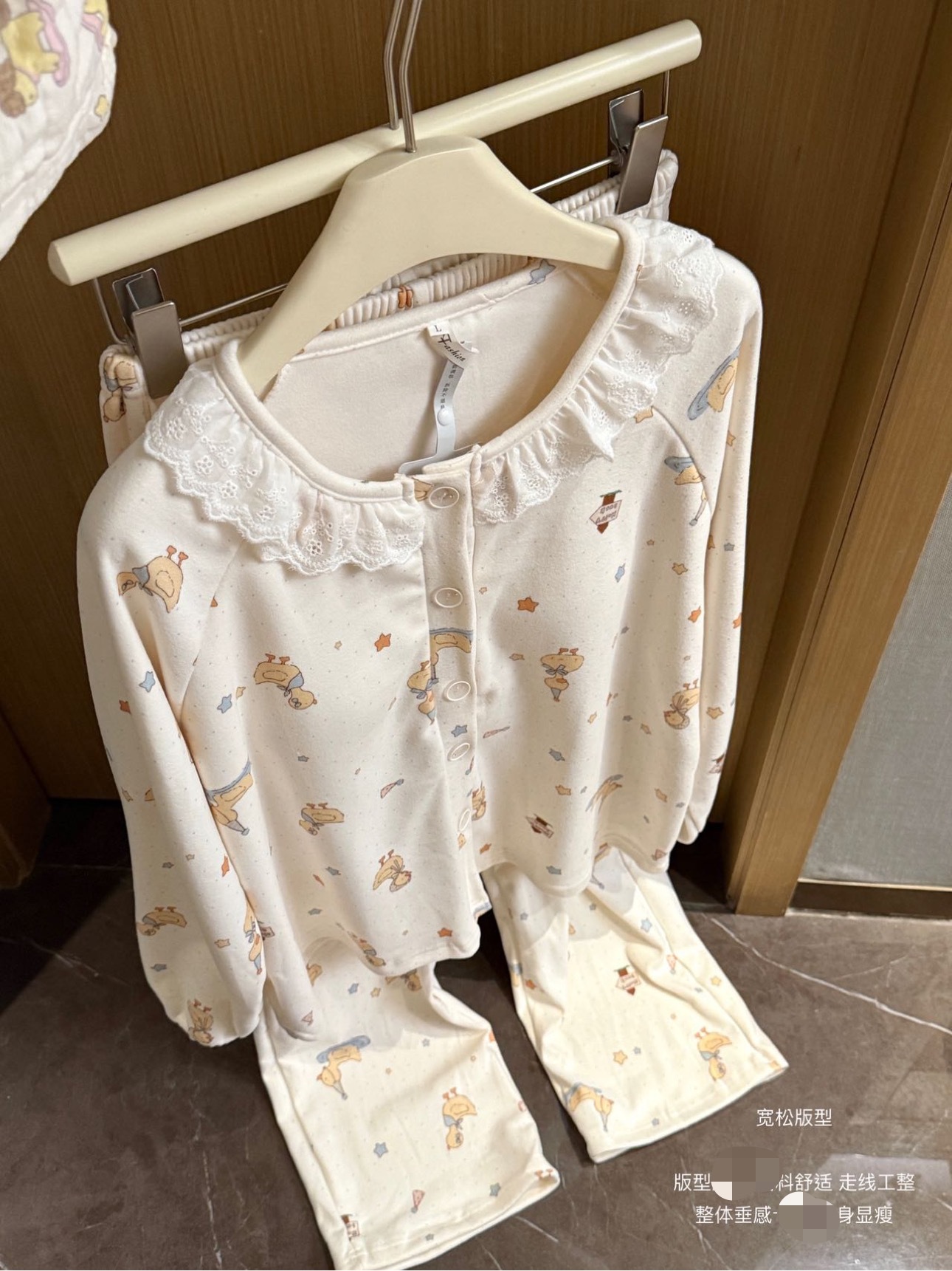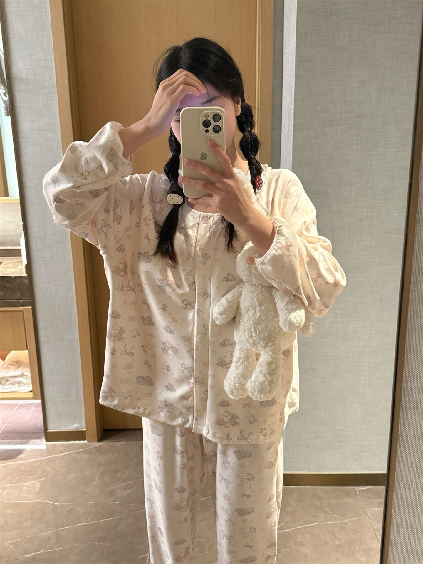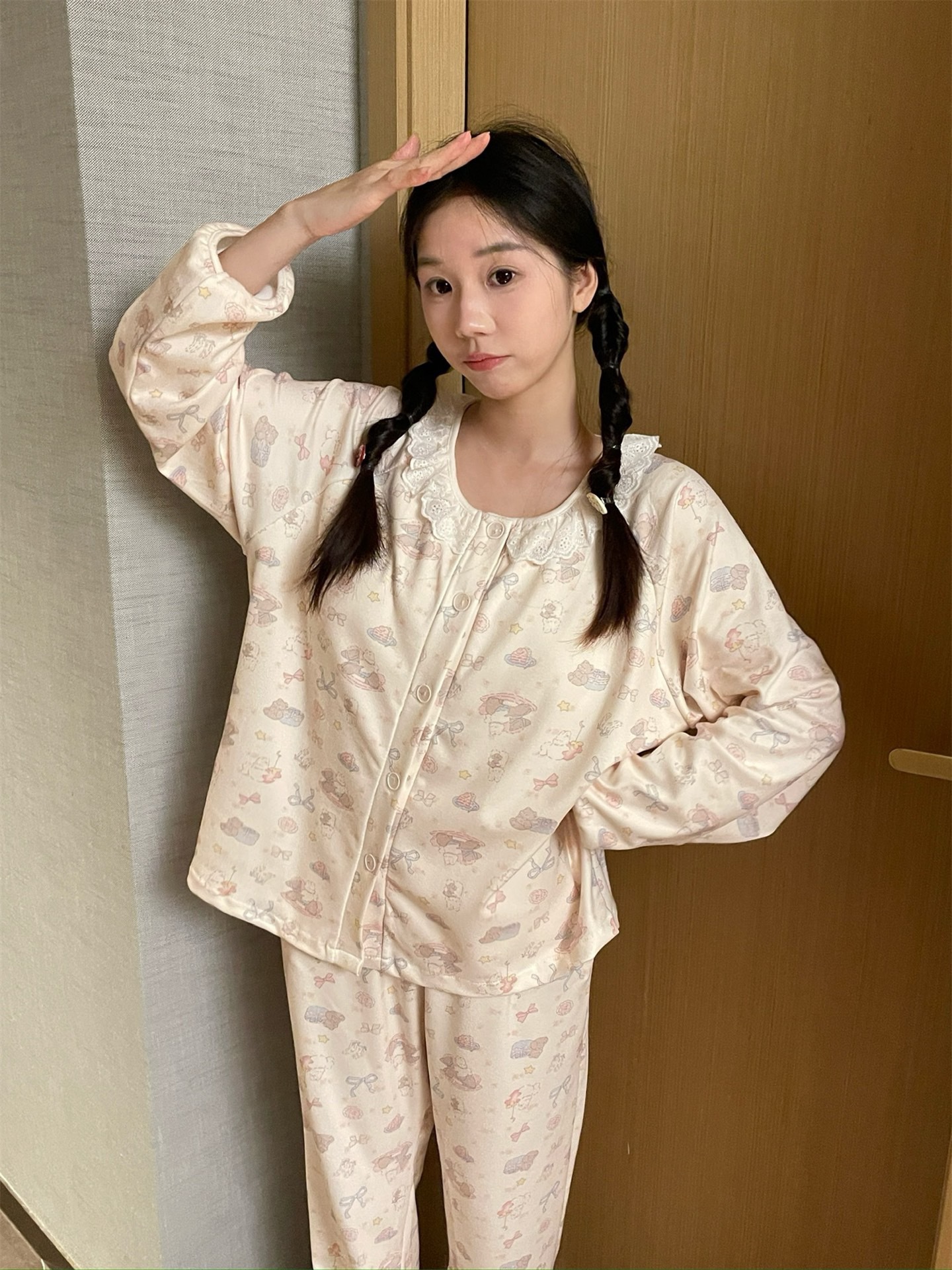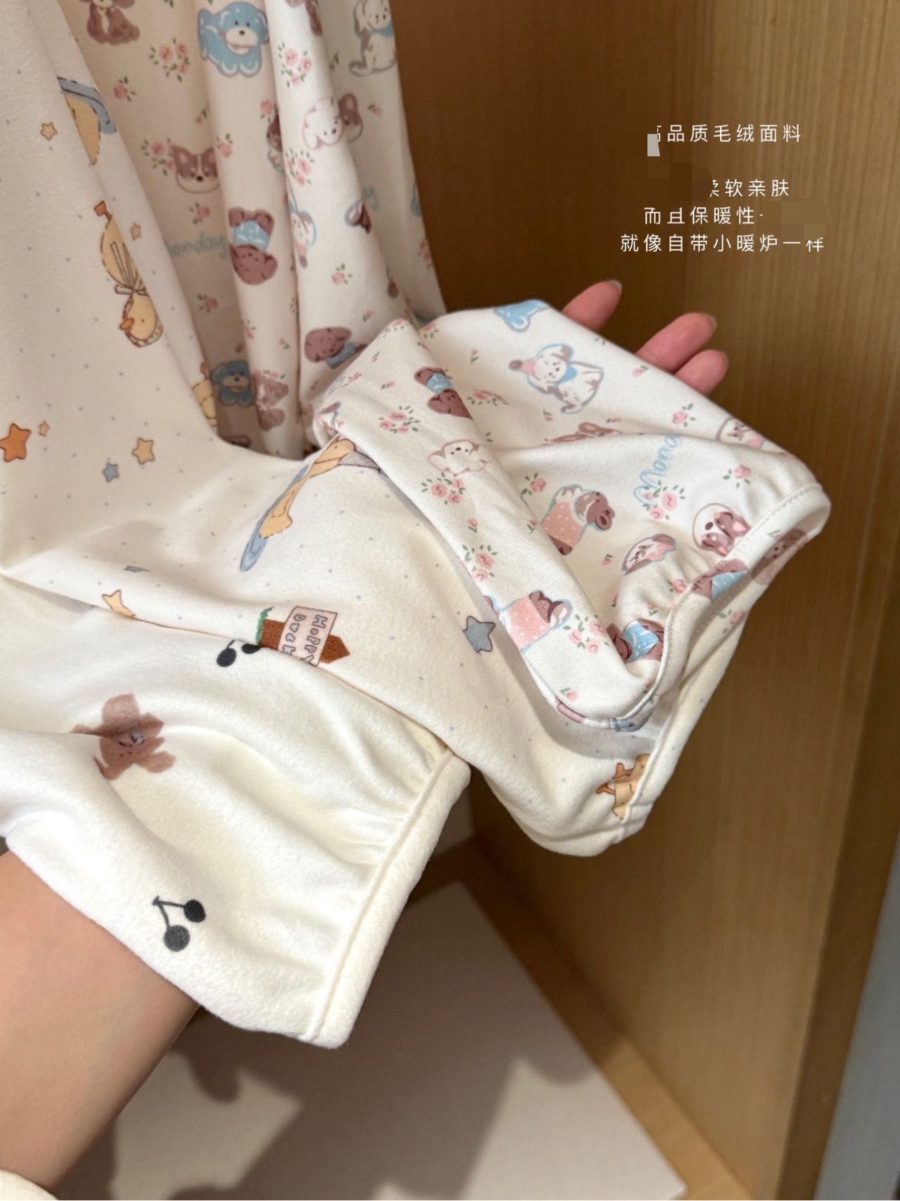 KXM公主蕾丝德绒家居服女秋冬新款自带胸垫甜美卡通圆领睡衣套装