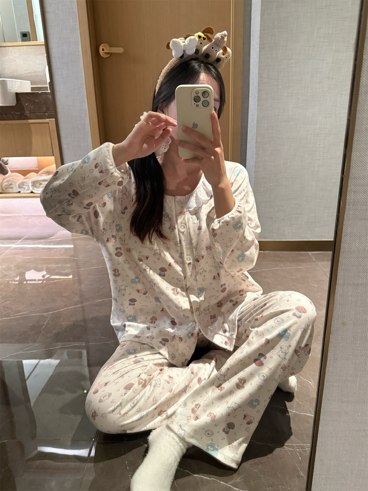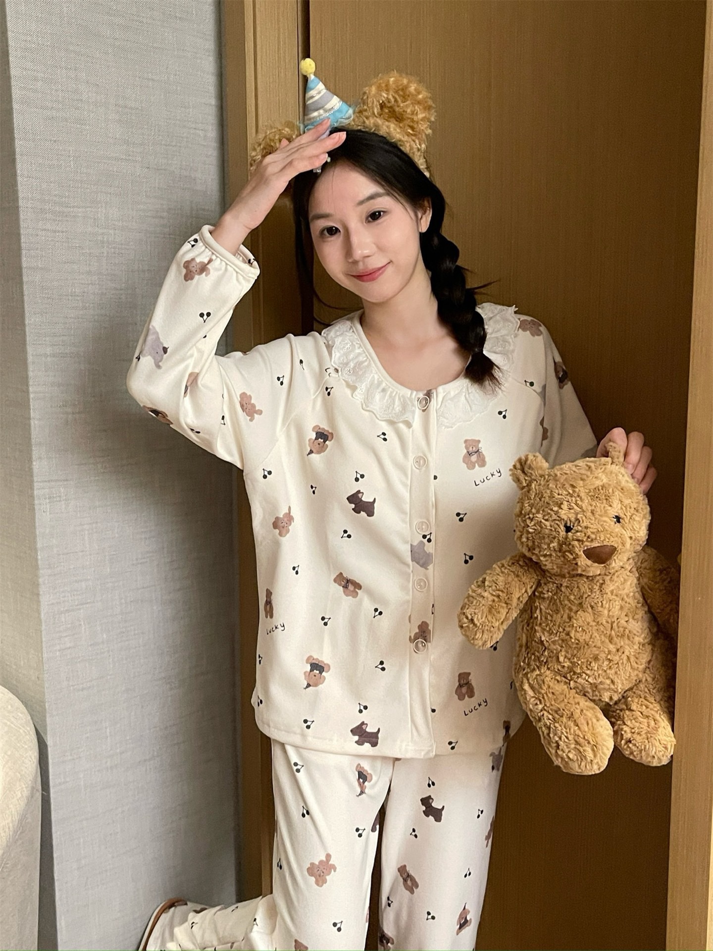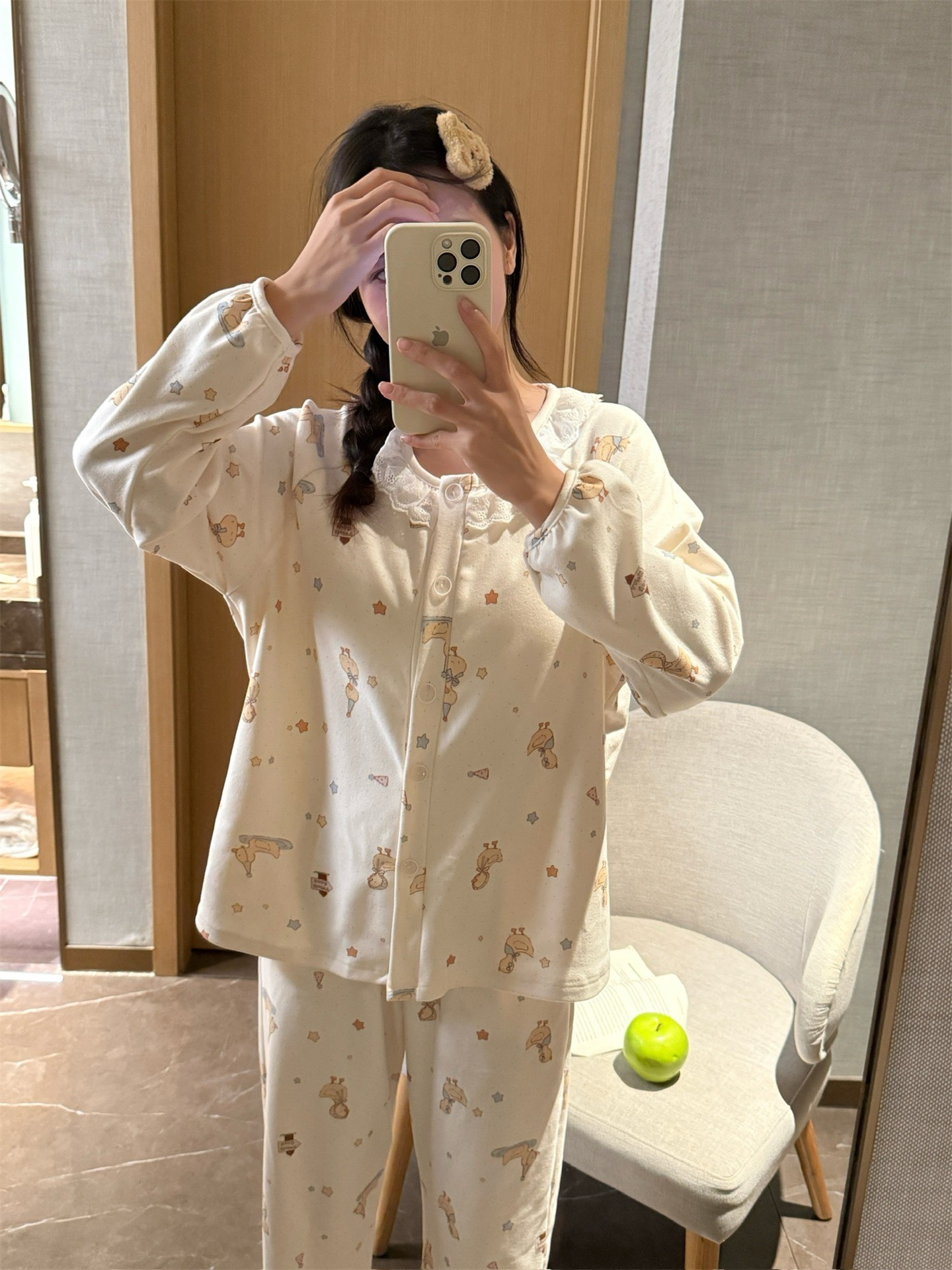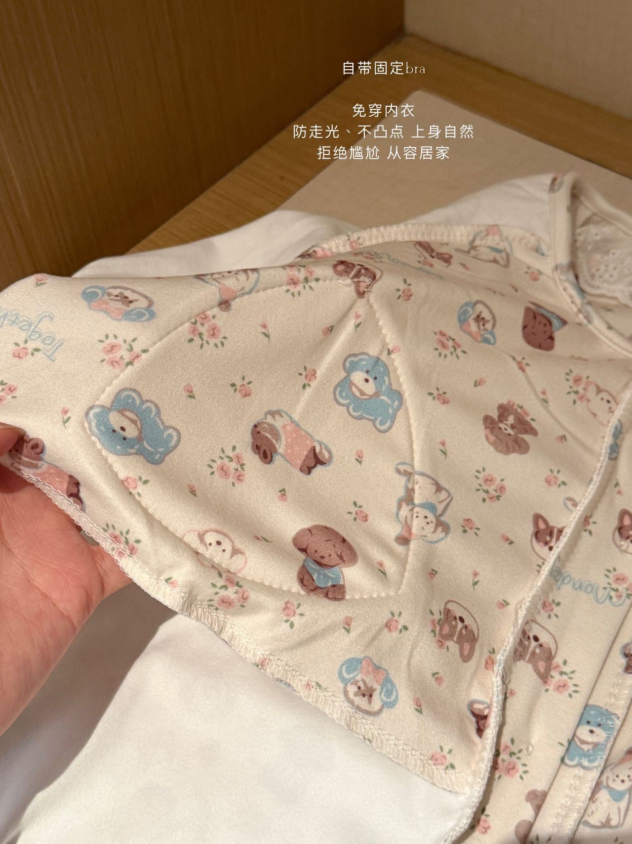 KXM公主蕾丝德绒家居服女秋冬新款自带胸垫甜美卡通圆领睡衣套装