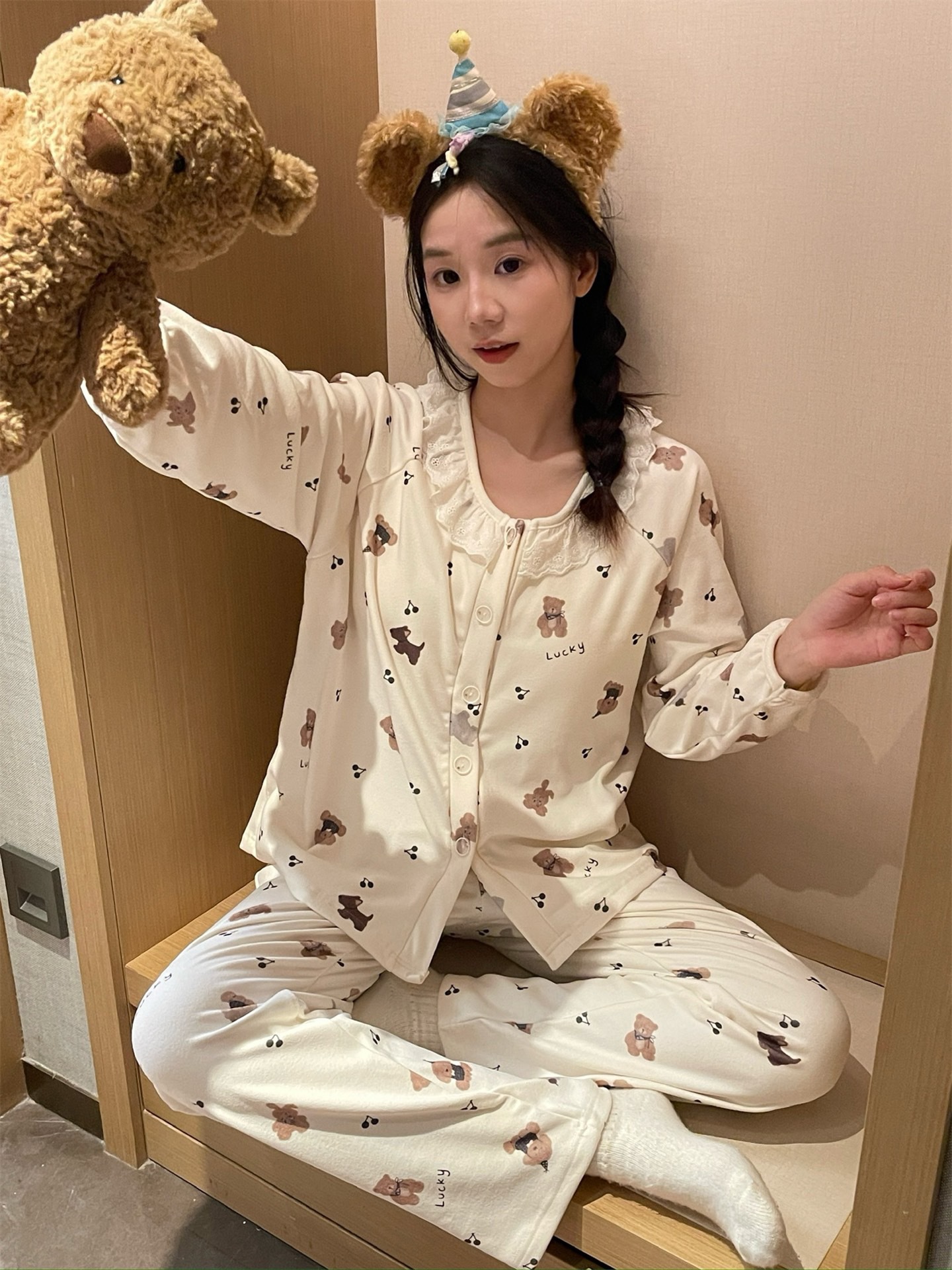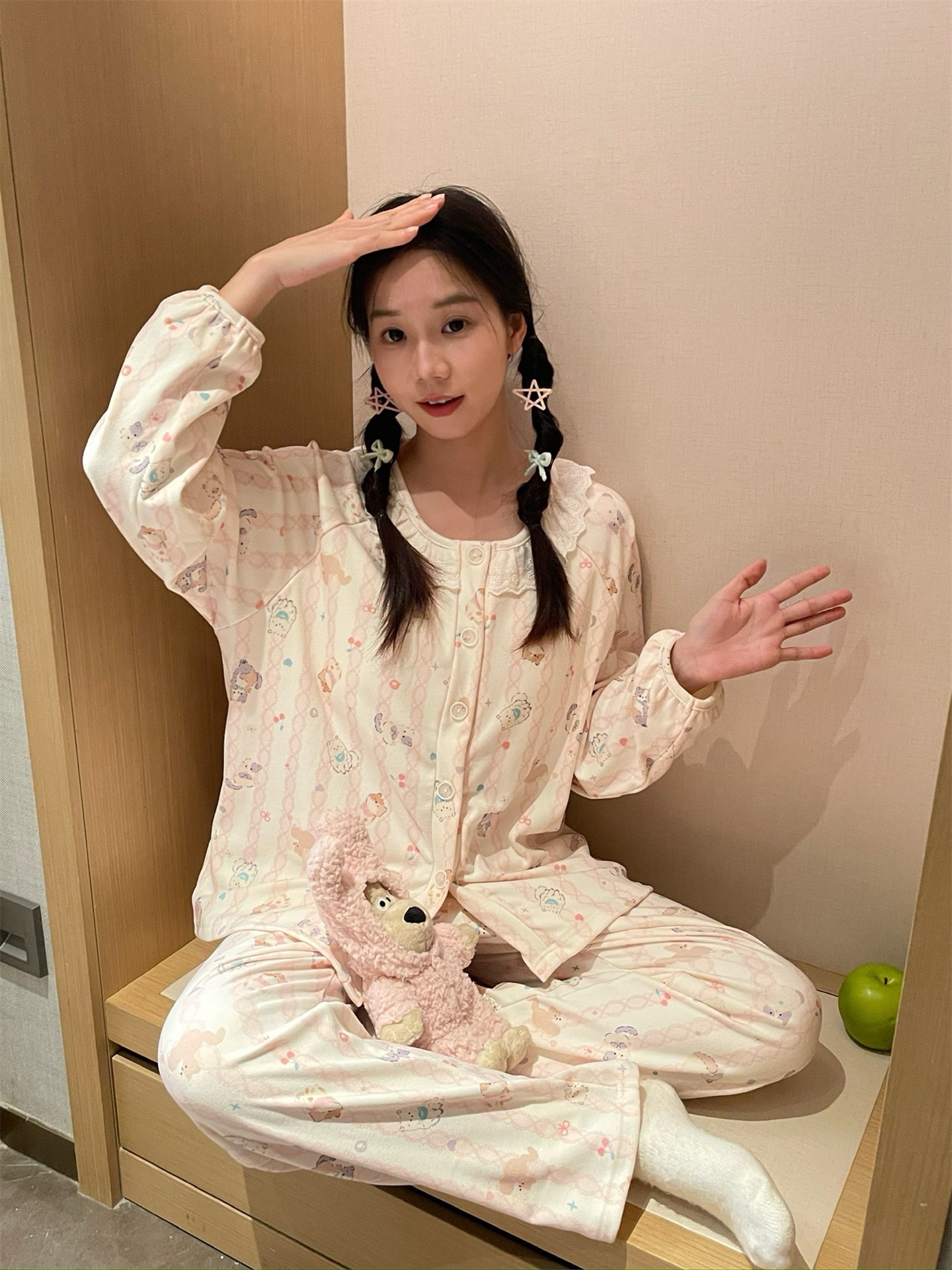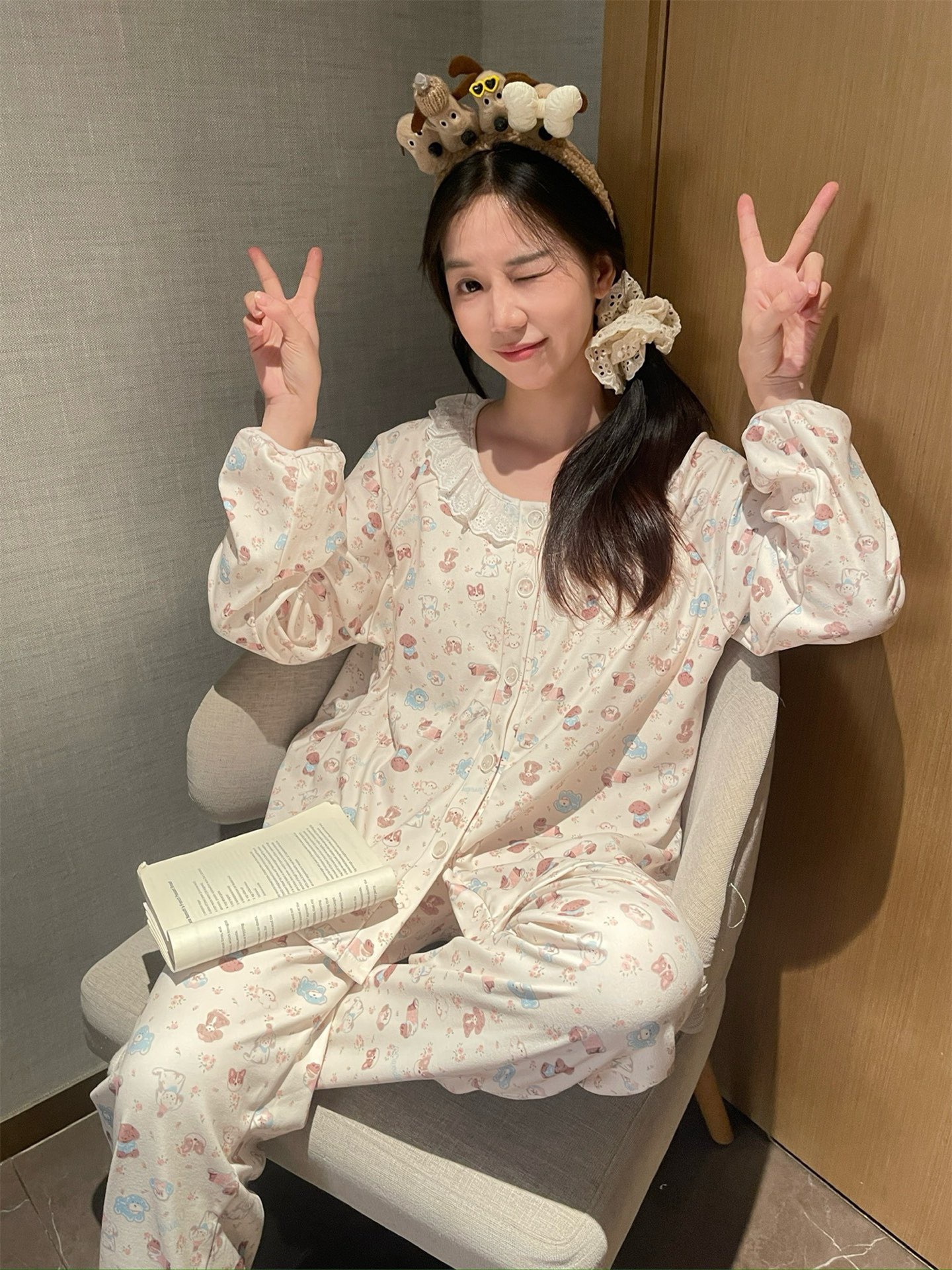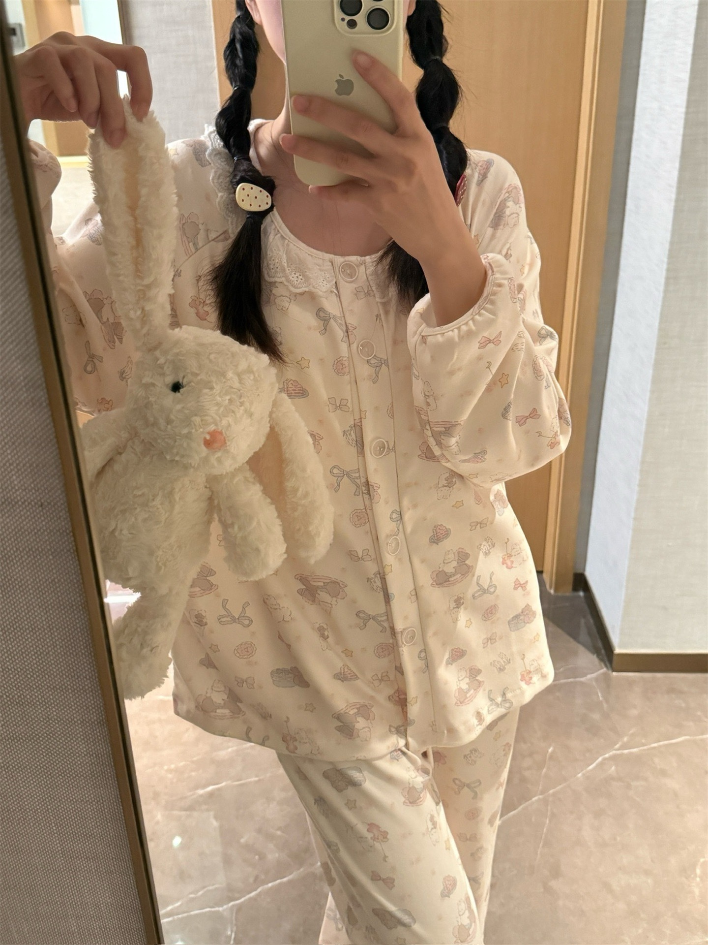 KXM公主蕾丝德绒家居服女秋冬新款自带胸垫甜美卡通圆领睡衣套装