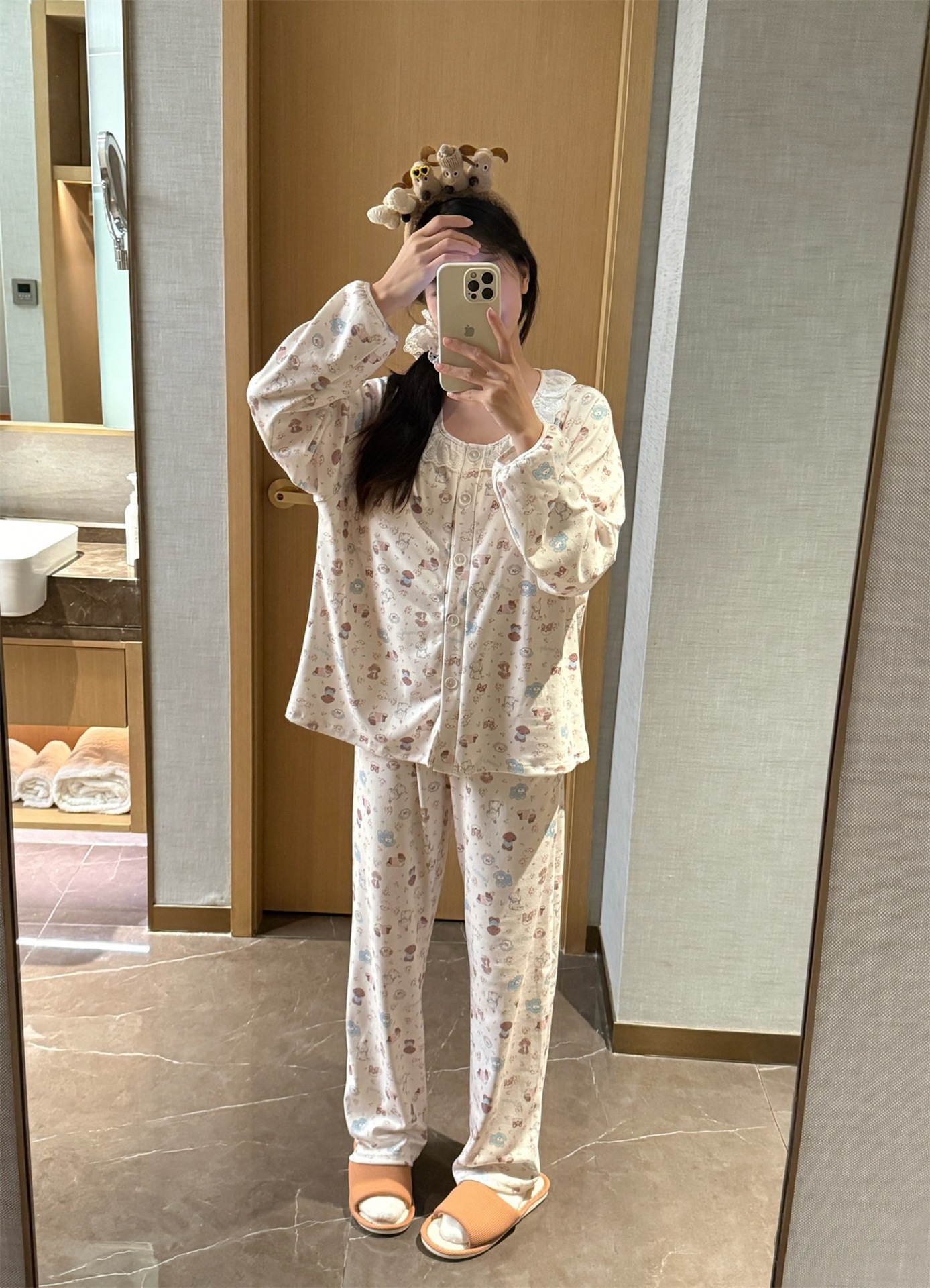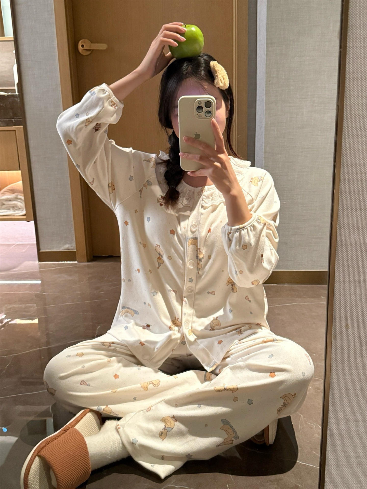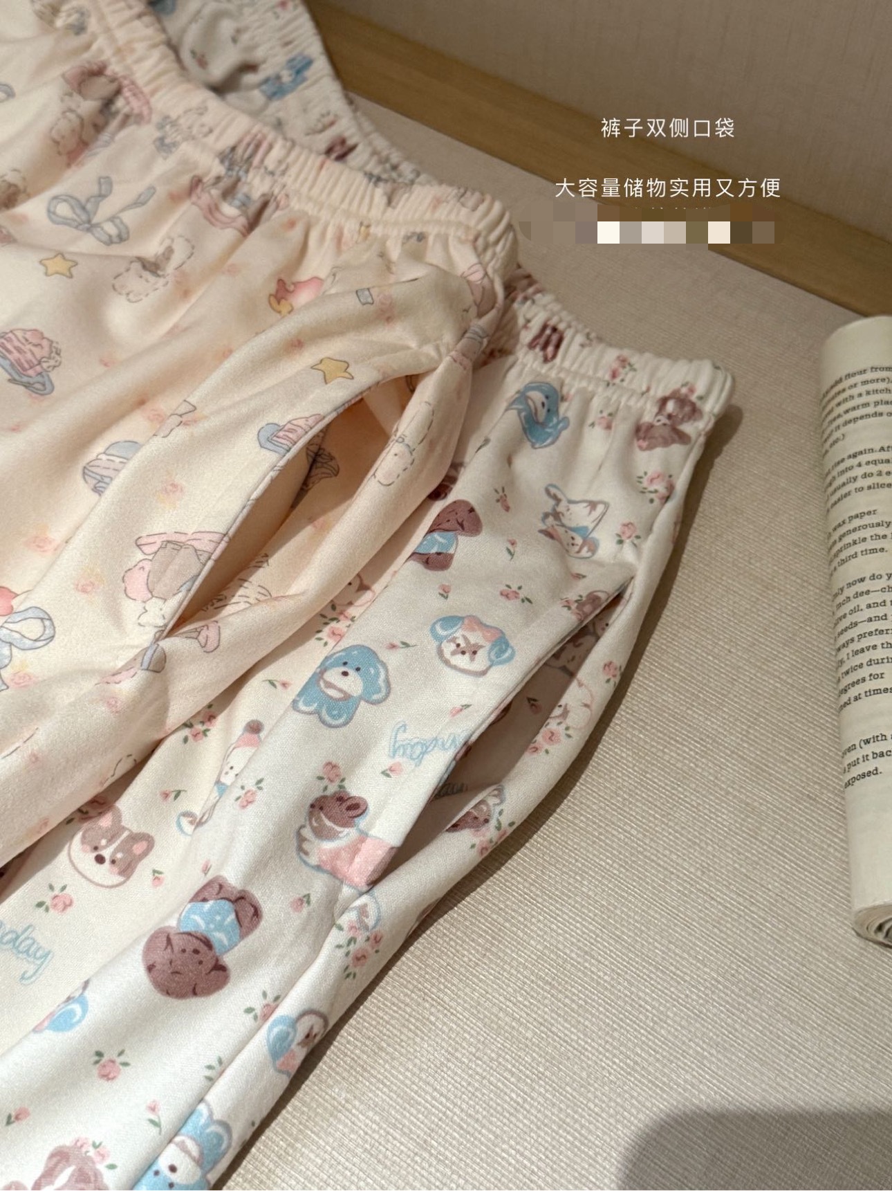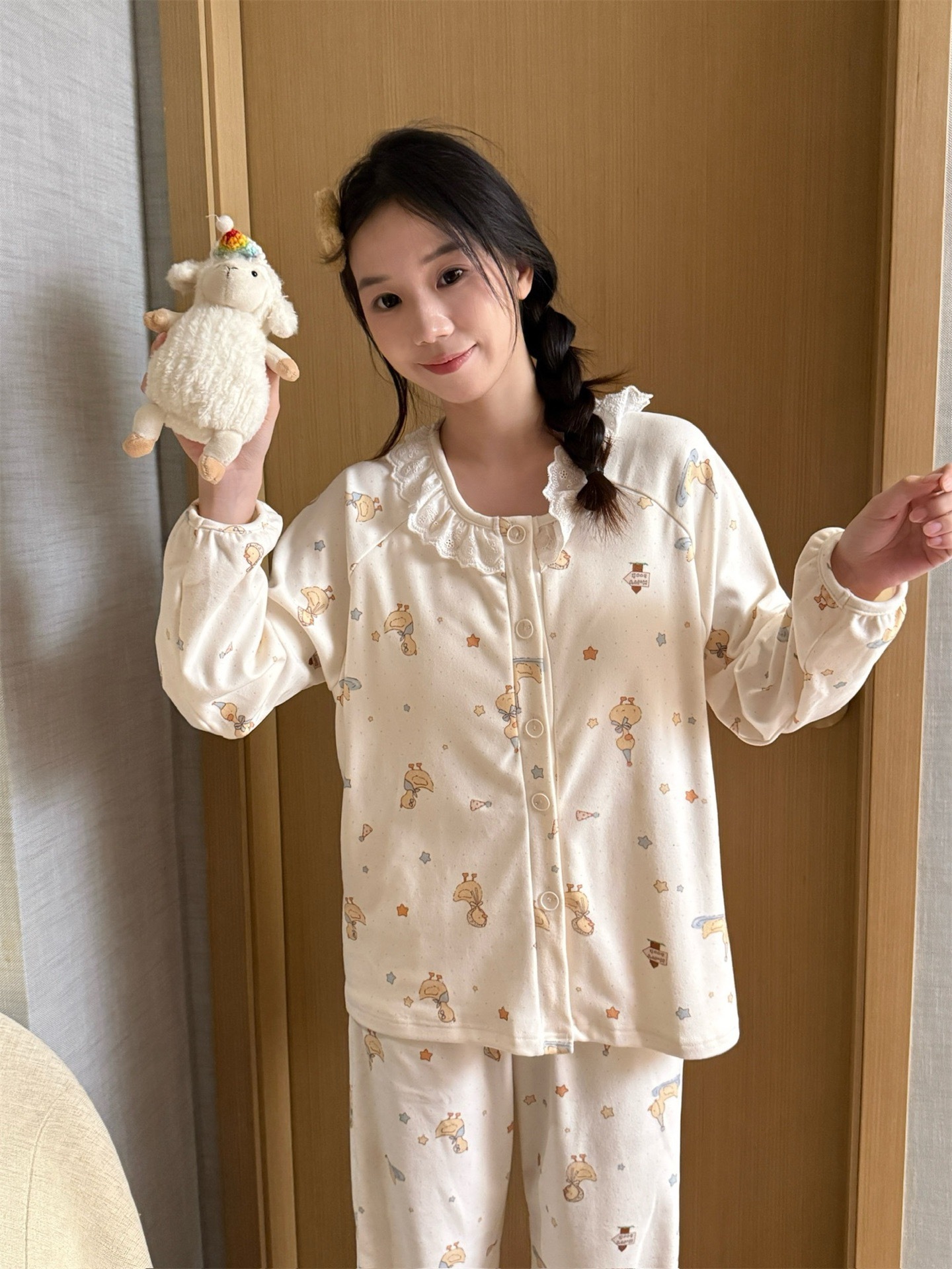 KXM公主蕾丝德绒家居服女秋冬新款自带胸垫甜美卡通圆领睡衣套装