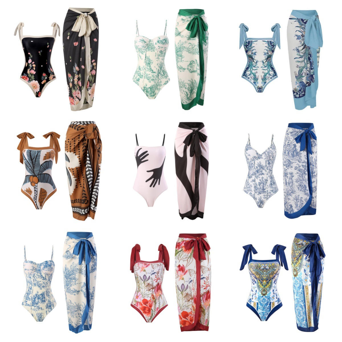 2025欧美连体保守遮肚沙滩温泉游泳衣三件套法式复古连体比基尼