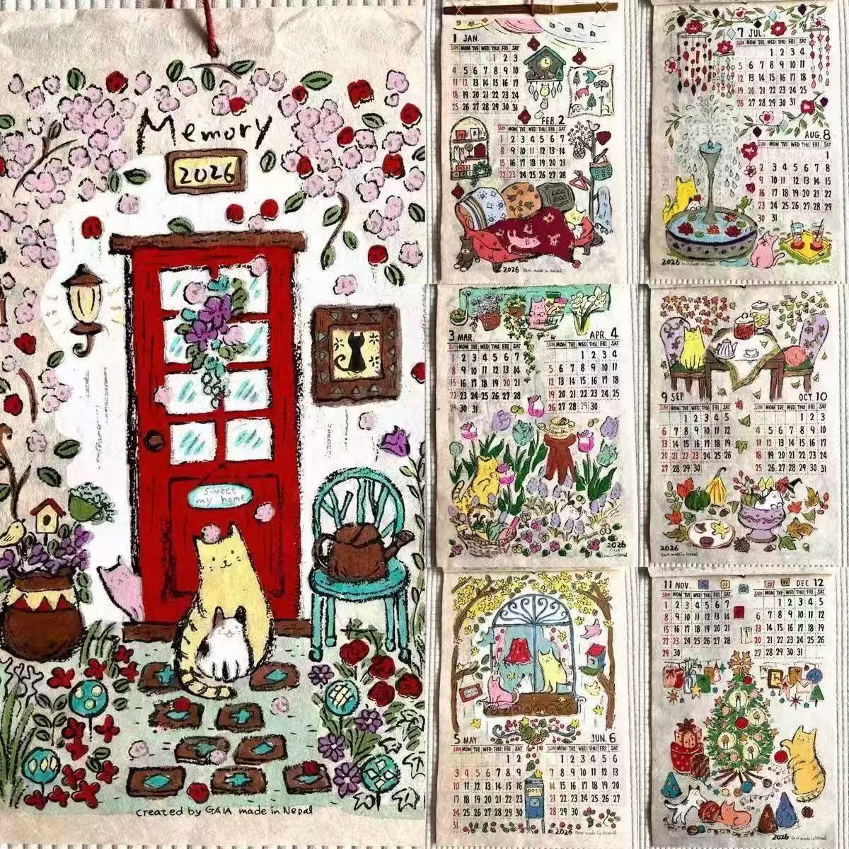 2026年尼泊尔日历小猫涂鸦插画台历年历小动物月历装饰挂件送礼物
