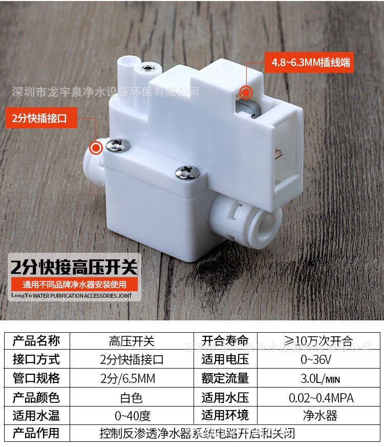 当进水压力过低或无水压时,低压开关启动,切断电路,纯水机停止工作!防止纯水机在无自来水时还在工作,损坏增压泵。
