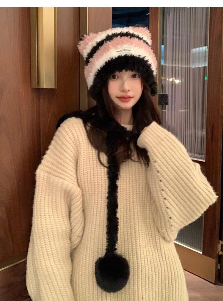 帽子女猫耳朵条纹毛线帽冬季帽子双毛球保暖帽皮标毛绒护耳针织帽