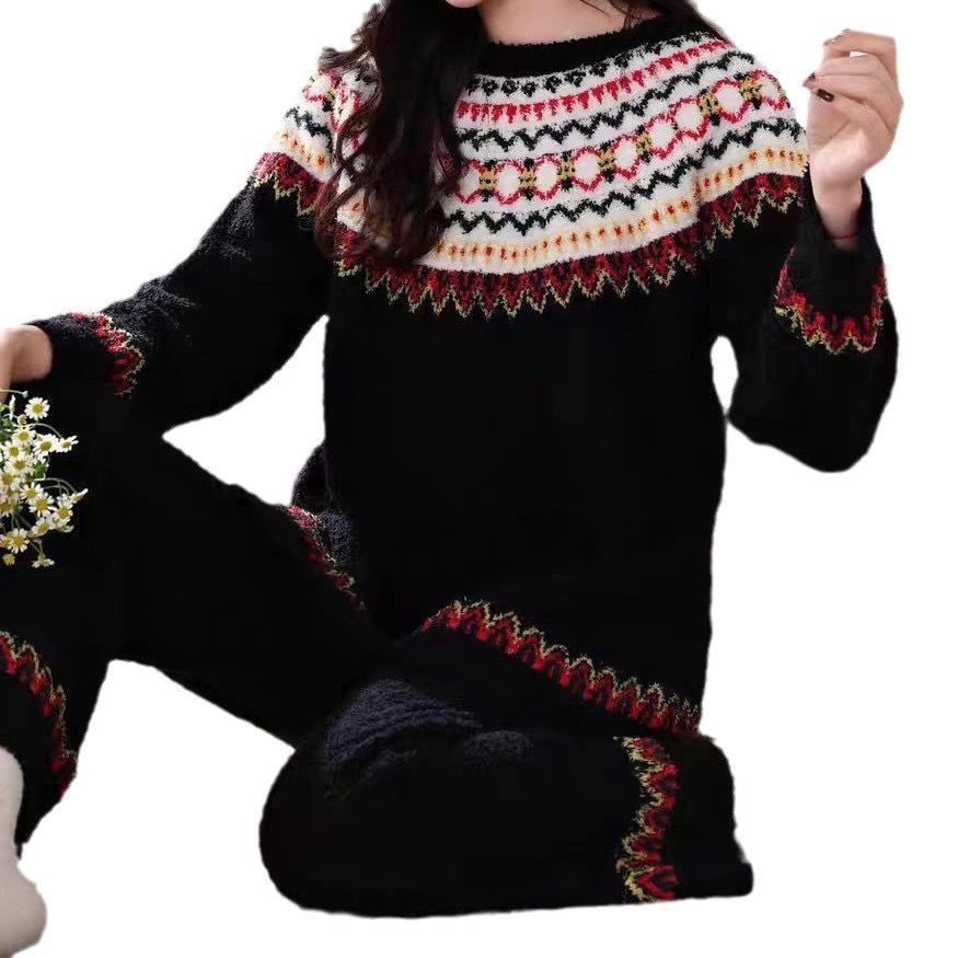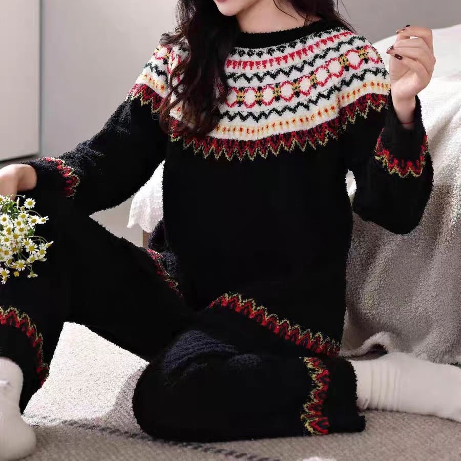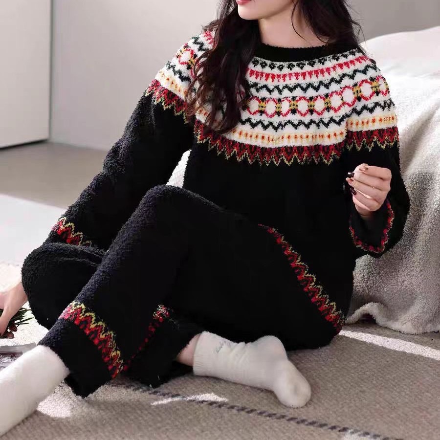 秋冬新款民族风睡衣半边绒加厚保暖可外穿家居服慵懒两件套女菱格