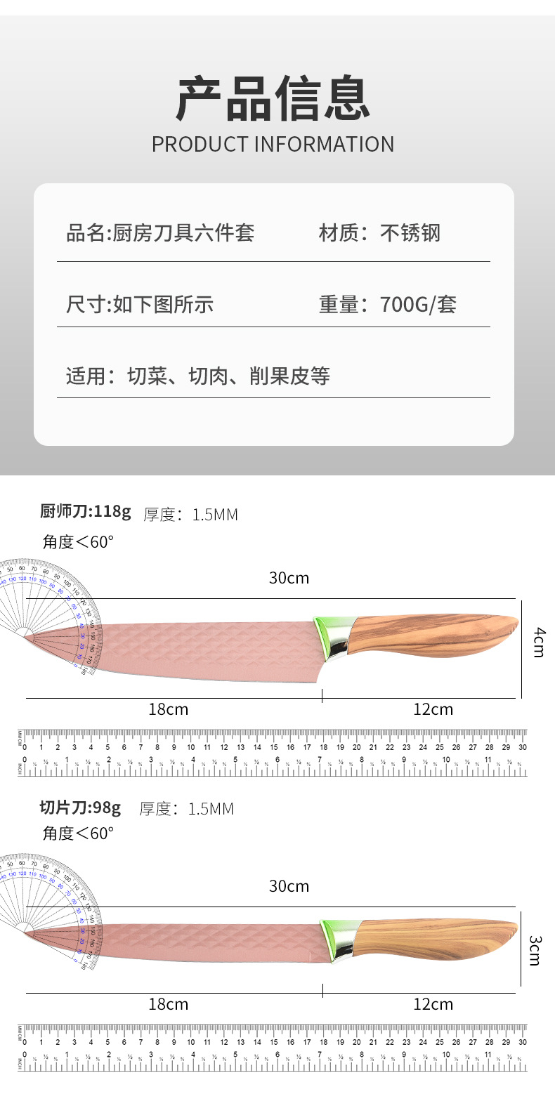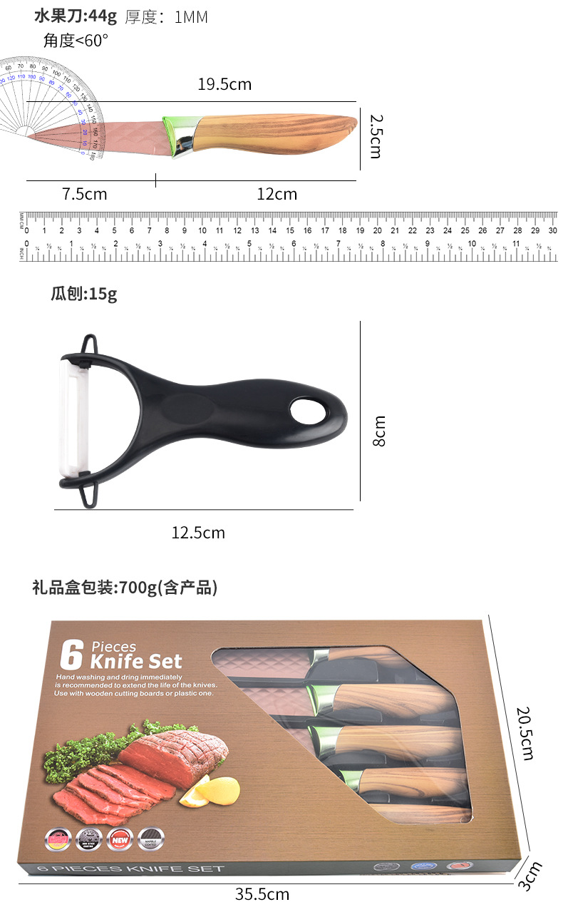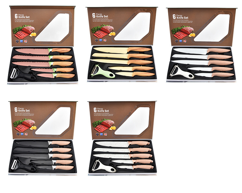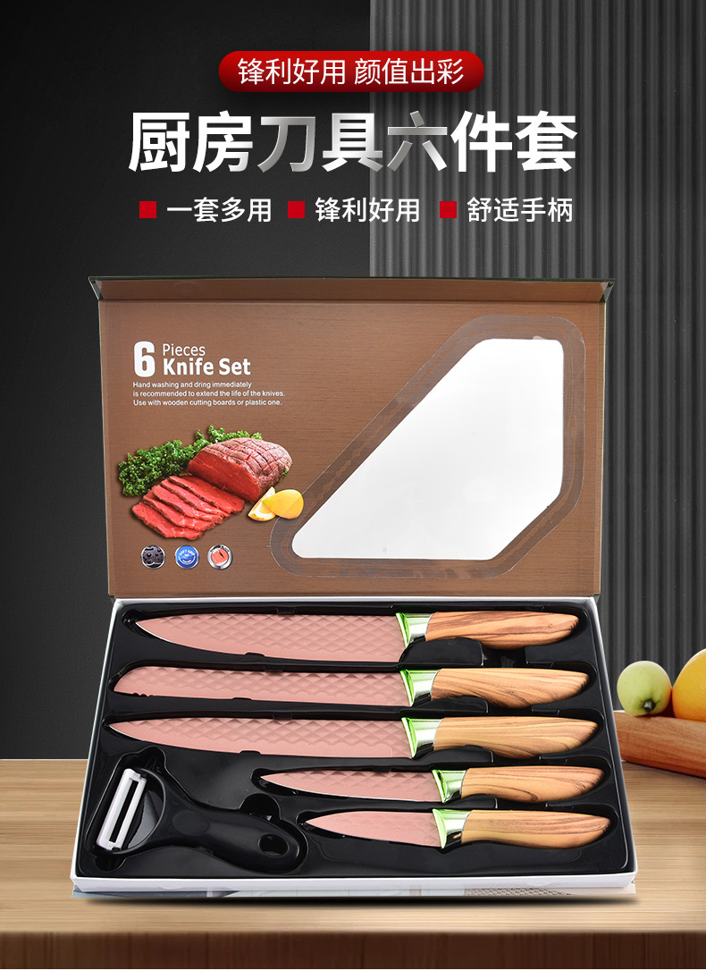 跨境热销不锈钢家用刀具套装新款电镀头翻盖盒木纹六件套锋利刀具,批发价,价格:16.1,厂家直销,跨境热销不锈钢家用刀具套装新款电镀头翻盖盒木纹六件套锋利刀具,免费拿样。