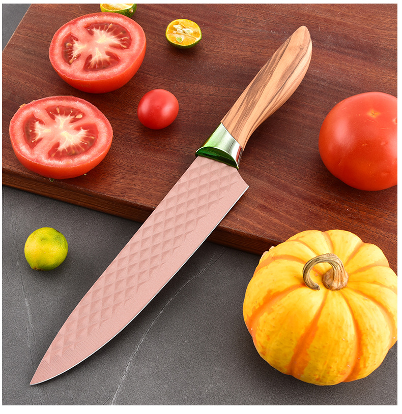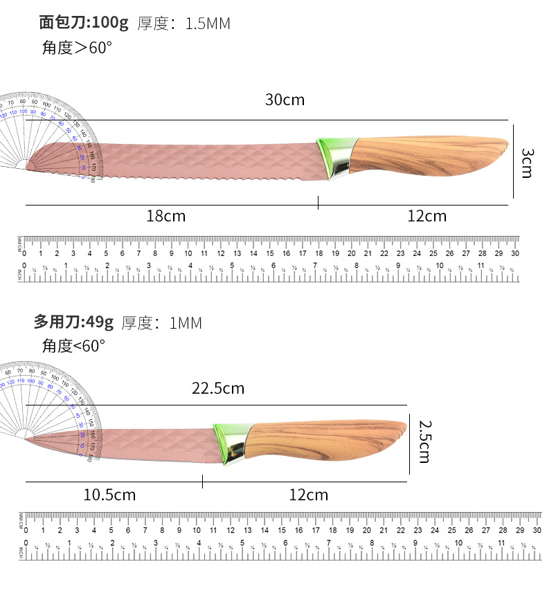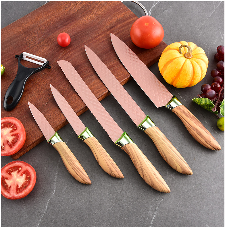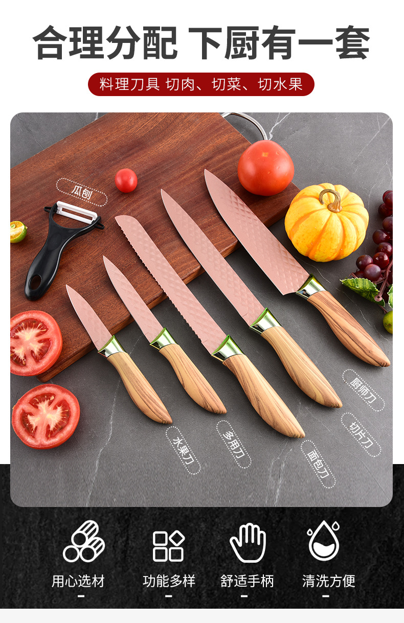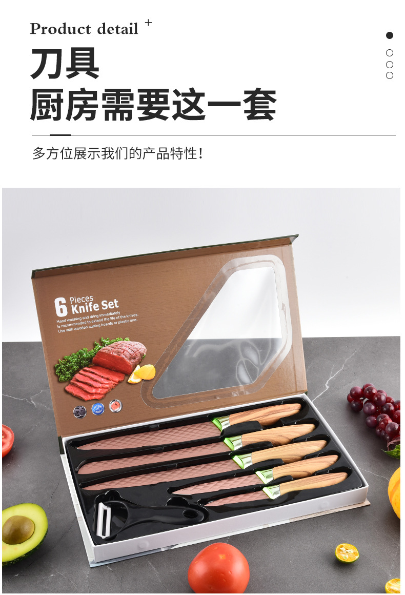 跨境热销不锈钢家用刀具套装新款电镀头翻盖盒木纹六件套锋利刀具
