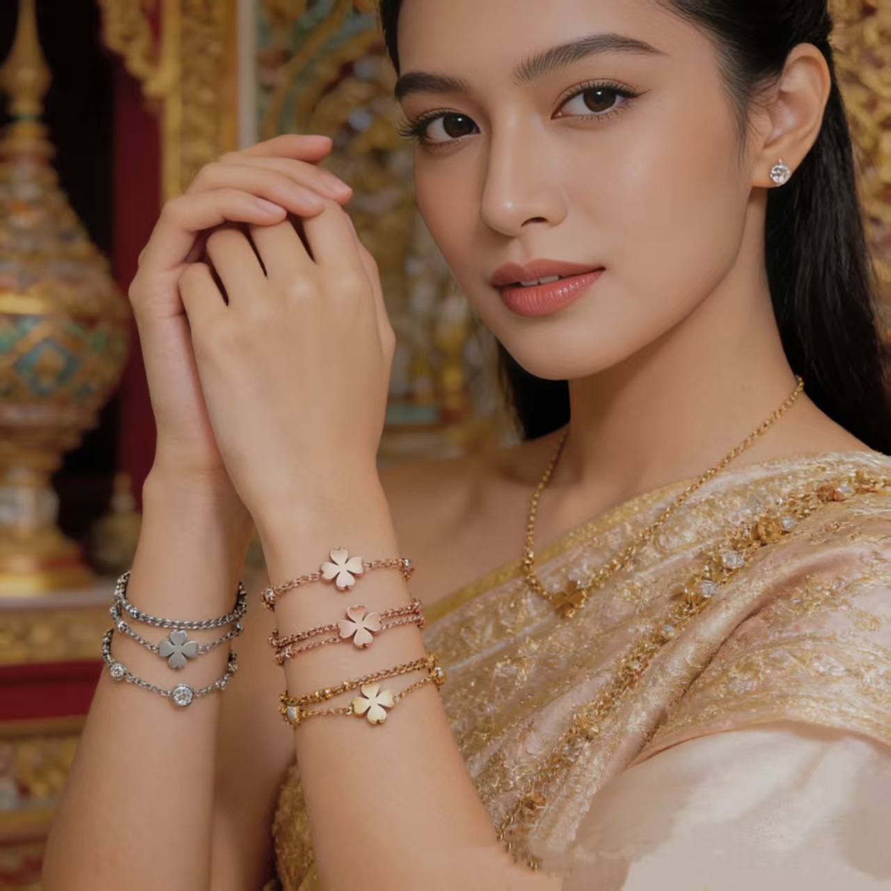欧美跨境四叶草手链女款轻奢幸运配钻石双层叠戴时尚镶钻钛钢手饰