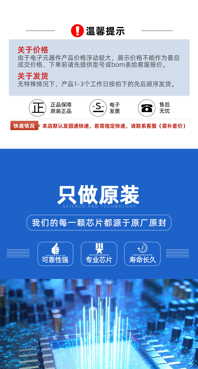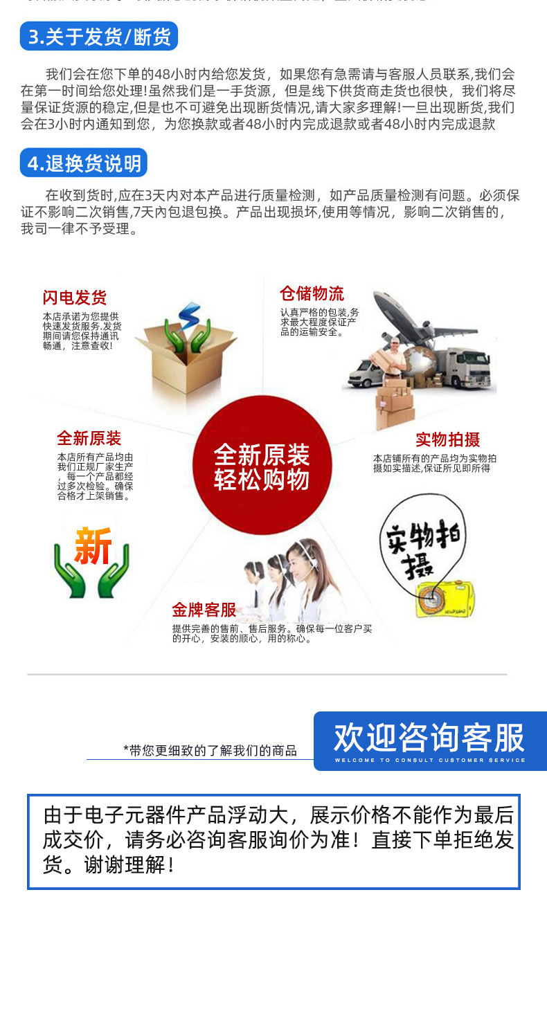 三:电子元件是专业型的产品,技术含量较高,本身可能存在着多种品牌,后辍与封装,可能导致参数与性能的差异,如有不慎,很有可能导致元件购买错误,所以请您务必在购买前,将产品的封装、后缀告诉我们!切勿直接拍下并付款!
