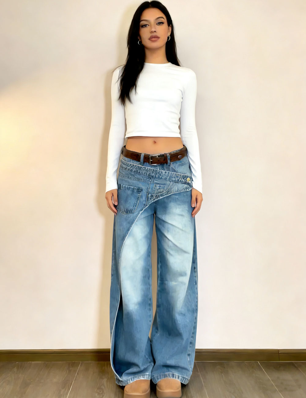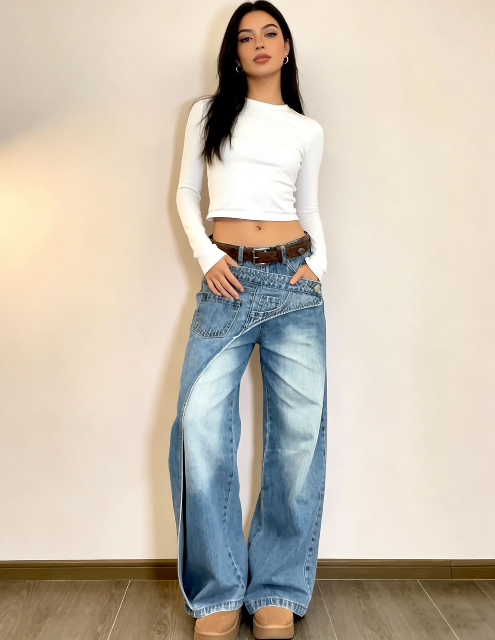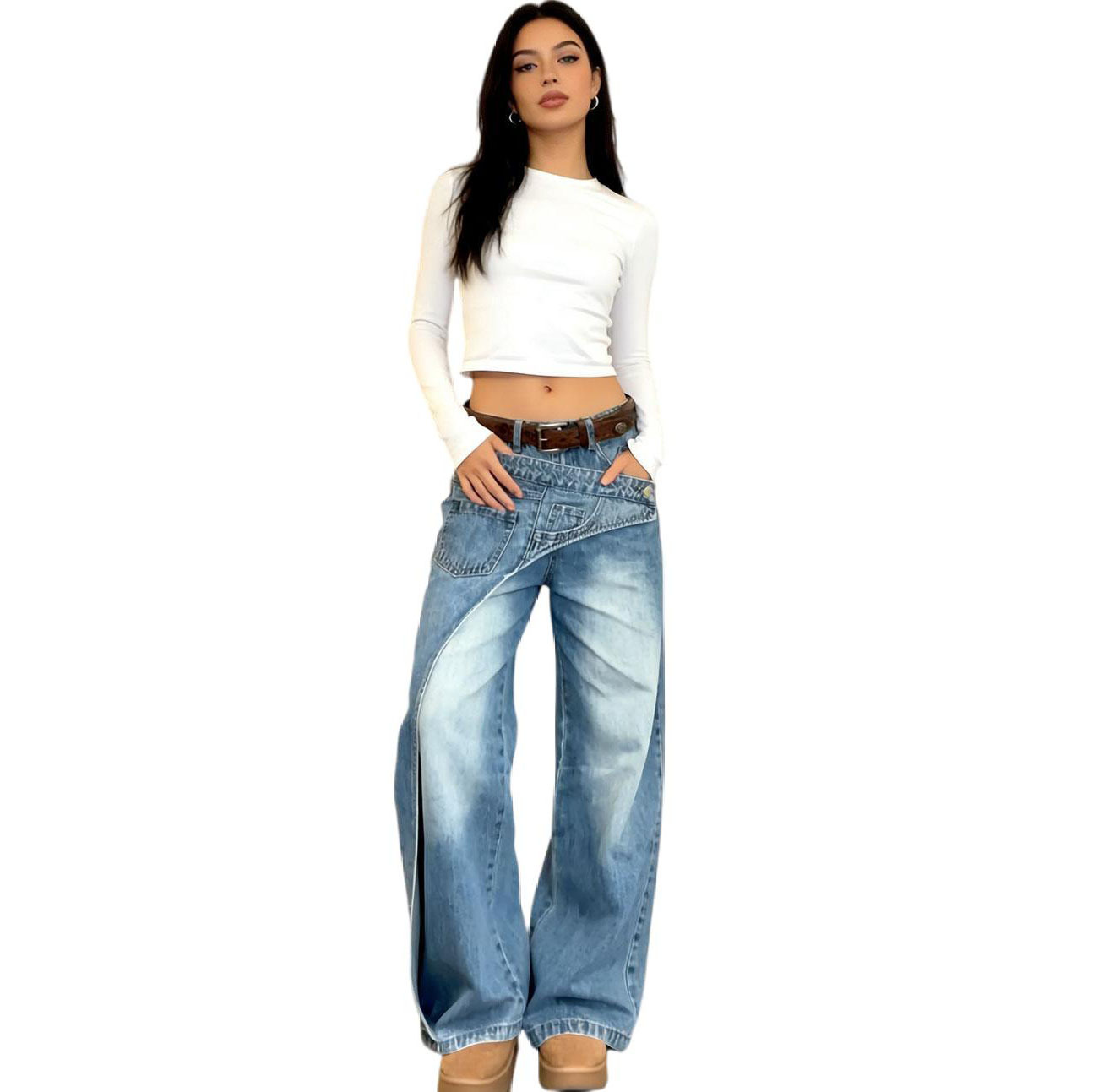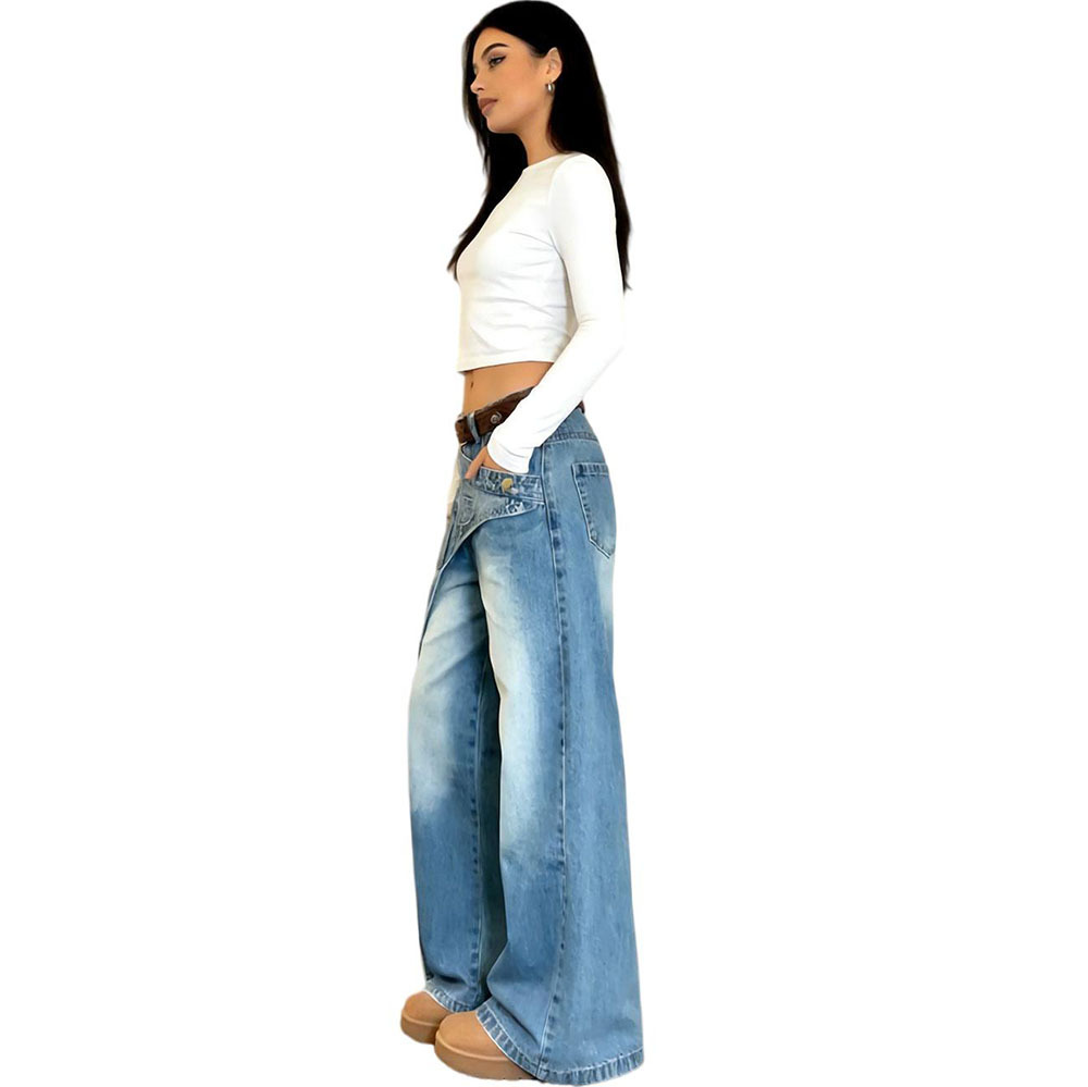 欧美女式休闲牛仔裤亚马逊跨境女装时尚个性水洗错位设计感直筒裤