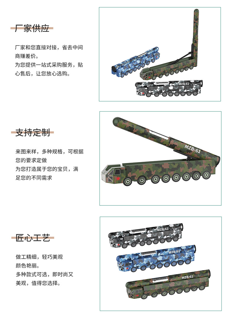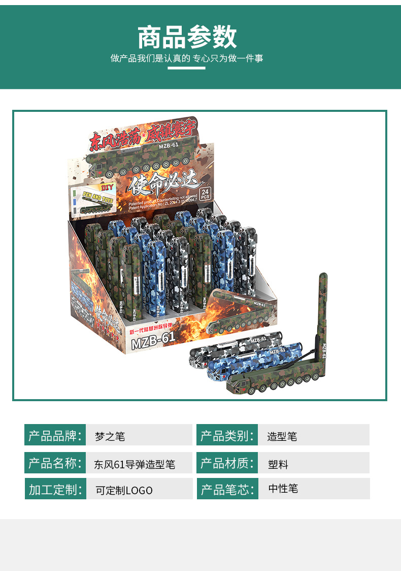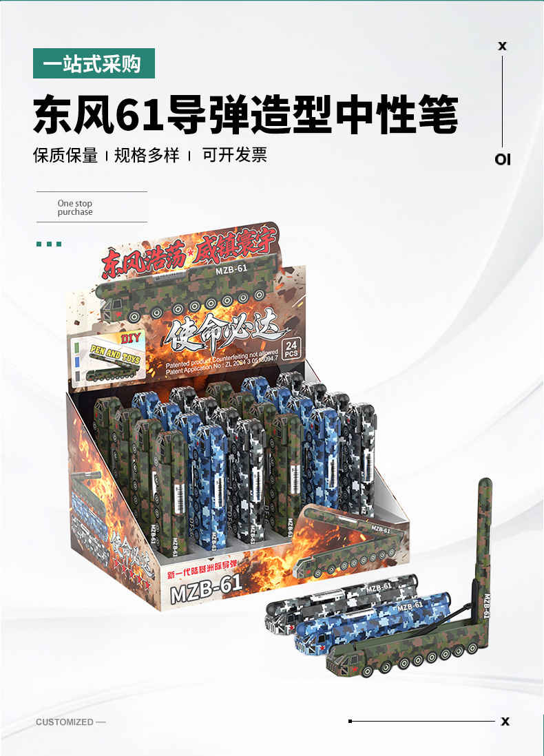 新款多功能造型笔创意东风61导弹迷彩造型中性笔可加LOGO圆珠笔,批发价,价格:4.25,厂家直销,新款多功能造型笔创意东风61导弹迷彩造型中性笔可加LOGO圆珠笔,免费拿样。