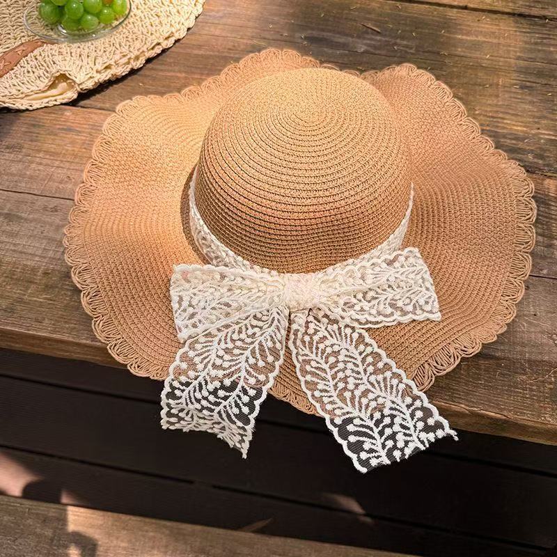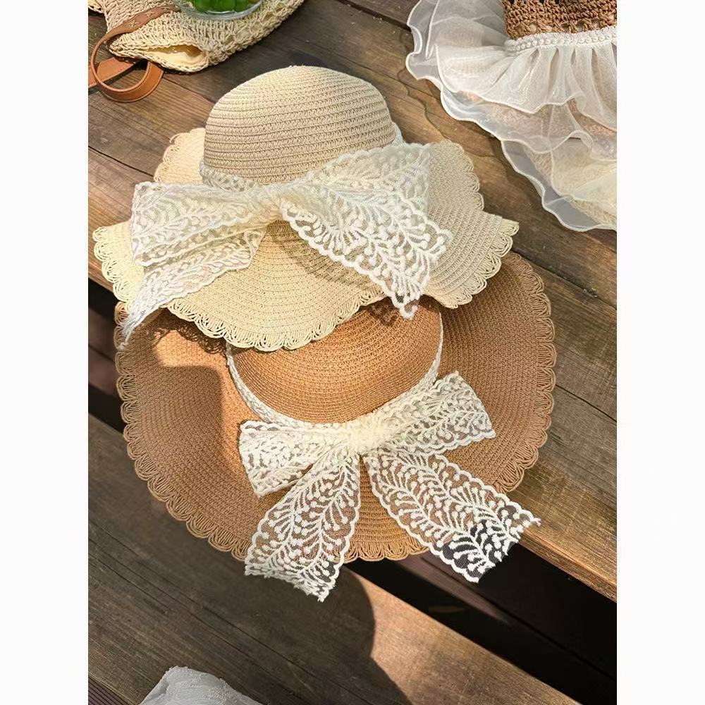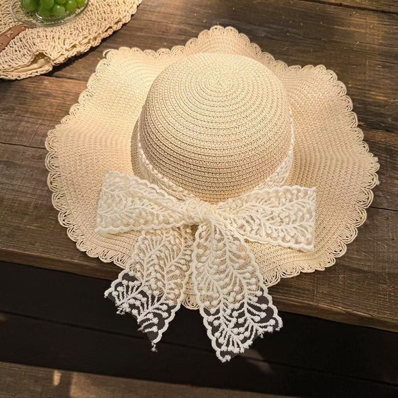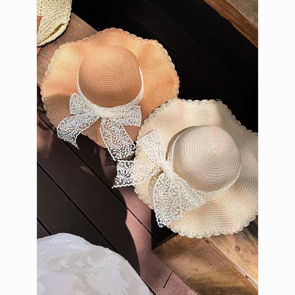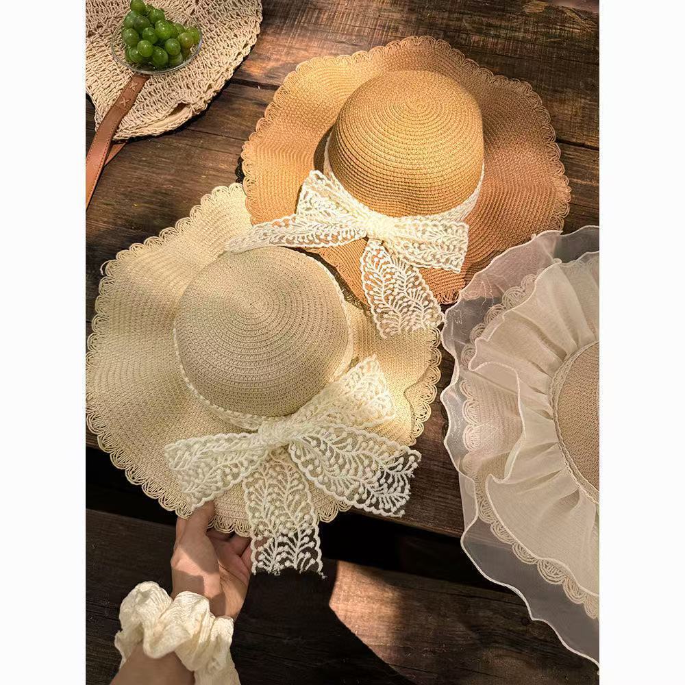 法式蕾丝蝴蝶结草帽女夏海边沙滩波浪边大帽檐太阳帽遮阳防晒帽子
