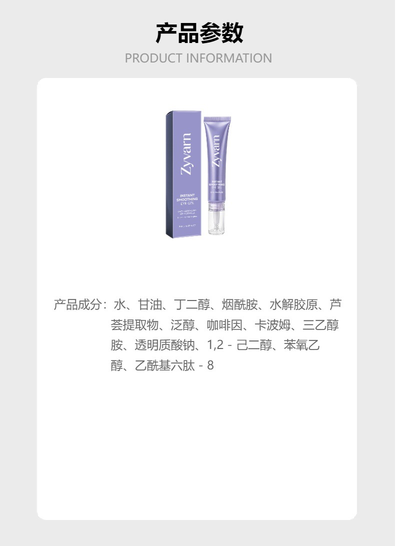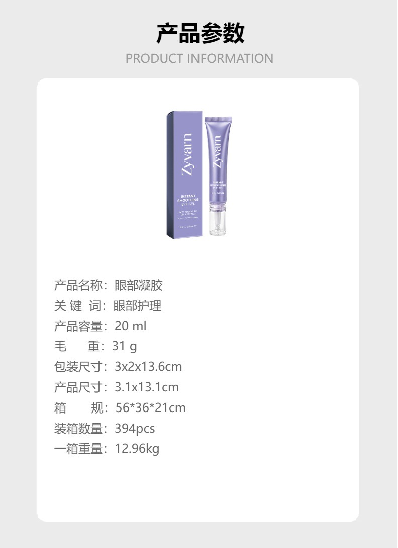 Zyvarn眼部凝胶 温和呵护眼部肌肤舒润柔滑细腻清爽保湿护理凝胶,批发价,价格:9,厂家直销,Zyvarn眼部凝胶 温和呵护眼部肌肤舒润柔滑细腻清爽保湿护理凝胶,免费拿样。